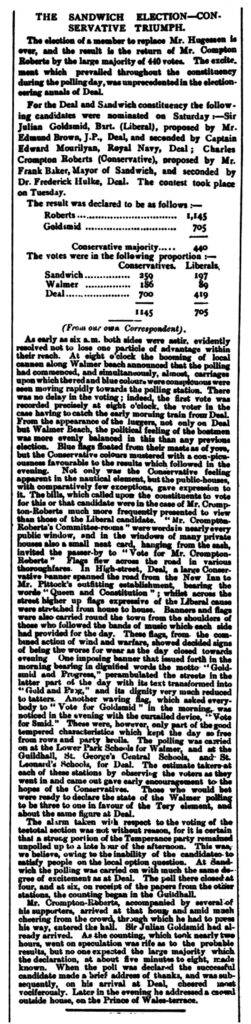 For the Deal and Sandwich constituency the following candidates were nominated on Saturday : Sir Julian Goldsmid, Bart. (Liberal), proposed by Mr. Edmund Brown, J.P., Deal, and seconded by Captain Edward Monrilyan, Royal Navy, Deal; Charles Crompton Roberts (Conservative), proposed by Mr. Frank Baker, Mayor of Sandwich, and seconded by Dr. Frederick Hulke, Deal. The contest took place on Tuesday.